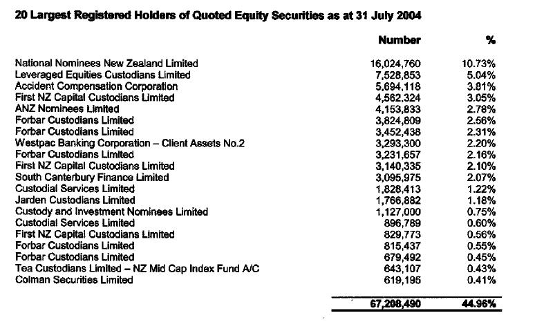 At the start of the month the news is with South Canterbury Finance. We cite here its connection with the former Feltex Carpets Ltd whoes fate we tend to focus on these days. Below is Feltex's top 10 shareholders soon after the IPO. Seventeen or so of these entities are masking companies, many of which seem to be associated with the lead brokers. Forbar is likely to imply Forsyth Barr connections while First New Zealand Capital is spelt out for a few. Of the remainder the Accident Compensation Corporation had about $9m of workers levies to donate to the cause. Forsyth Barr's chief executive chaired the ACC's investment committee at the time. And South Canterbury came in with almost a $5m contribution. Some sort of South Island comradity between Hubbard and Edgar might have been involved there with the two perhaps perhaps sharing the mantle of richest SIer following the death of Howard Paterson one year earlier. If South Canterbury had $1b in this was a throw-away of just one half of a per cent. But it was perhaps the start of the running off the rails.